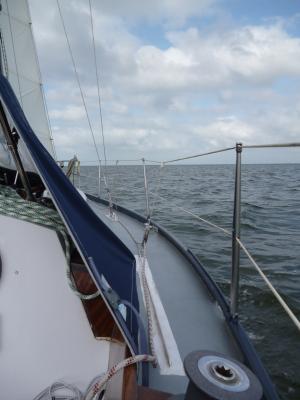 Aber vorher ist natürlich noch eine ganze Menge geschehen. Ich habe den Rumpf innen entrostet und neu gestrichen, habe ein neues Rigg gekriegt (das sind die Abspannungen des Mastes) und letzten Sonntag hat mir Ralf die Windfahnensteuerung gebracht und gleich beim Montieren geholfen. Ausserdem habe ich noch ein gutes Dutzend andere Kleinigkeiten erledigt. Heute nun bin ich in Lemmer losgefahren. Bei anfangs moderaten Wind habe ich das Handling der Windfahnensteuerung geübt. Sie macht noch nicht immer das, was ich will aber das wird schon noch. Dann frischte der Wind auf und es kam eine hackige Welle dazu. Das Ziel Stavoren habe ich dann abgehackt, da hätte ich genau gegenan aufkreuzen müssen. So bin ich nun in Medemblik, wohlwissen, dass es dann morgen gegen den Wind gegen Norden gehen wird. Aber da soll der Wind (und damit auch die Wellen) geringer sein.