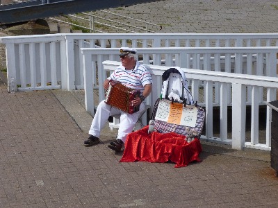 Auch der Strassenmusiker ist mit dem Meer verbunden, Typ Seemann, der alte Seemanslieder spielt. "Junge, komm bald wieder ...."