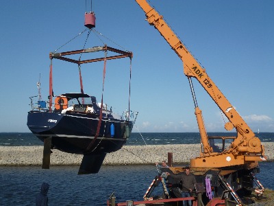 Das Loch wurde geflickt, das Boot trocken gemacht und auch der Motor von Fachleuten gründlich gecheckt. Leider war dann ein paar Tage der Wind zu stark, so dass der Kran nicht in Betrieb genommen werden konnte. Aber am Samstag war es dann doch gut, das Boot kam ins Wasser und alles ging problemlos.